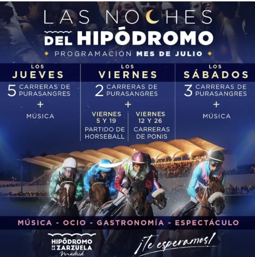 Y es que, este año, La Zarzuela, ha hecho una extensísima temporada de carreras nocturnas. Otros años, estas carreras, se disputaban los Jueves en Julio y Agosto, y este año, desde junio nos sorprendieron con carreras Jueves y Sábados. Además, ha sido a inicios de esta semana que han publicado una extensa lista de carreras y eventos para el mes de Julio, en los que además de las carreras, veremos música en directo, DJs e incluso partidos de horseball ¿no suena a planazo?